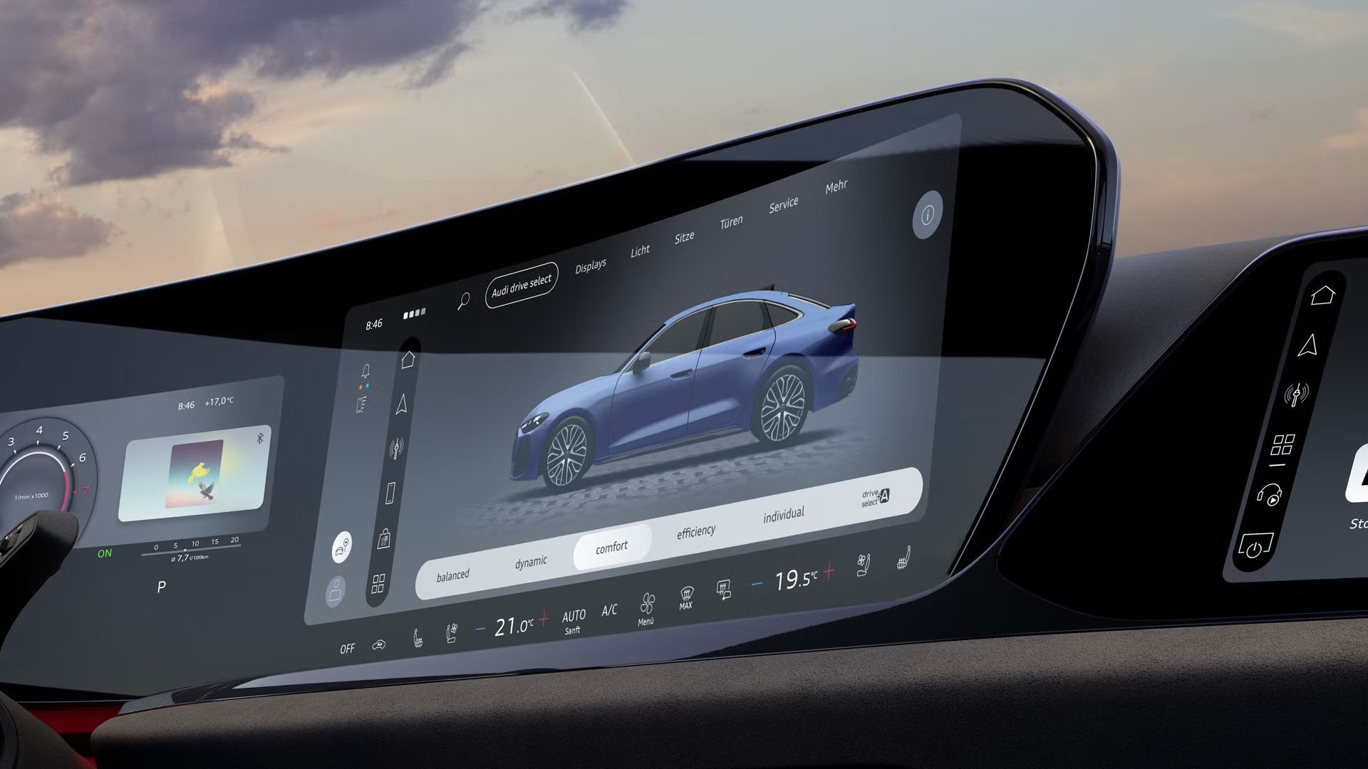 El display panorámico OLED curvo, compuesto por el Audi virtual cockpit plus y la pantalla táctil MMI, está completamente orientado al conductor. En combinación con el MMI para el acompañante, permite, por ejemplo, controlar de forma independiente la navegación y el entretenimiento.